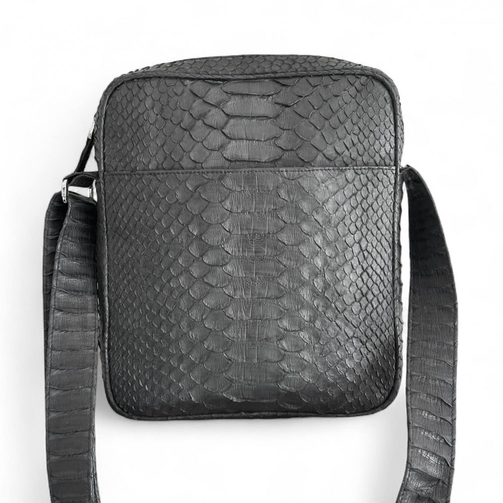Модная, универсальная мужская сумка через плечо из натуральной кожи питона. Данная модель имеет один  карман на кнопке с лицевой стороны и один карман на молнии с обратной стороны. Внутри одно основное отделение,  два кармана для телефона и прочих необходимых вещей, а также один карман на молнии. Основное отделение закрывается на молнию.