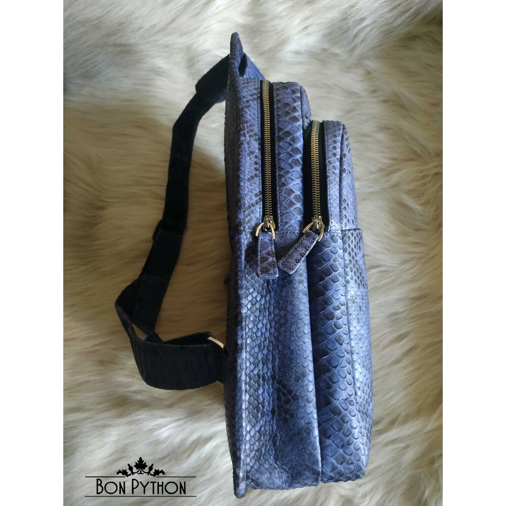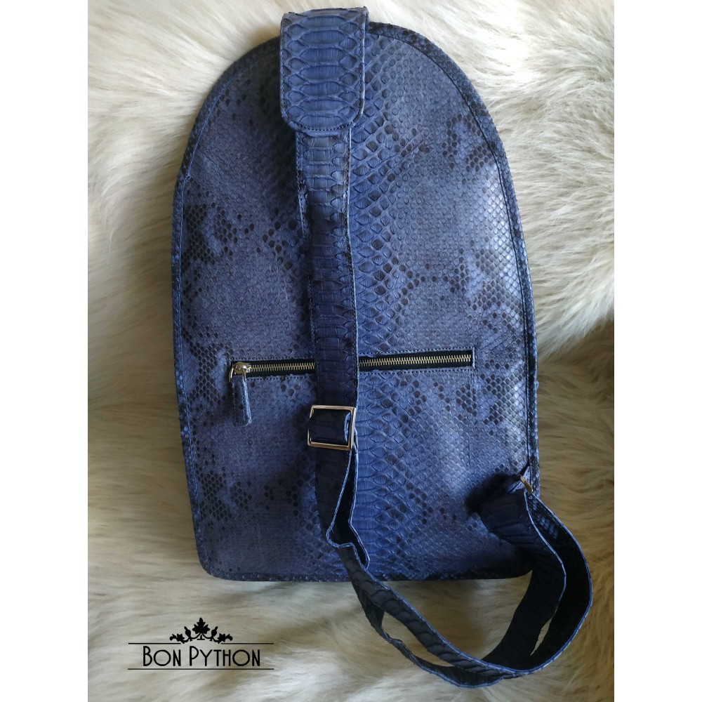 Мужской рюкзак выполнен из кожи королевского питона в синем цвете.  Содержит 5 отделений: впереди два основных больших отделения, одно отделение, закрывающееся на молнию и карман на кнопке, сзади одно отделение на молнии. Шлейка регулируется по длине.